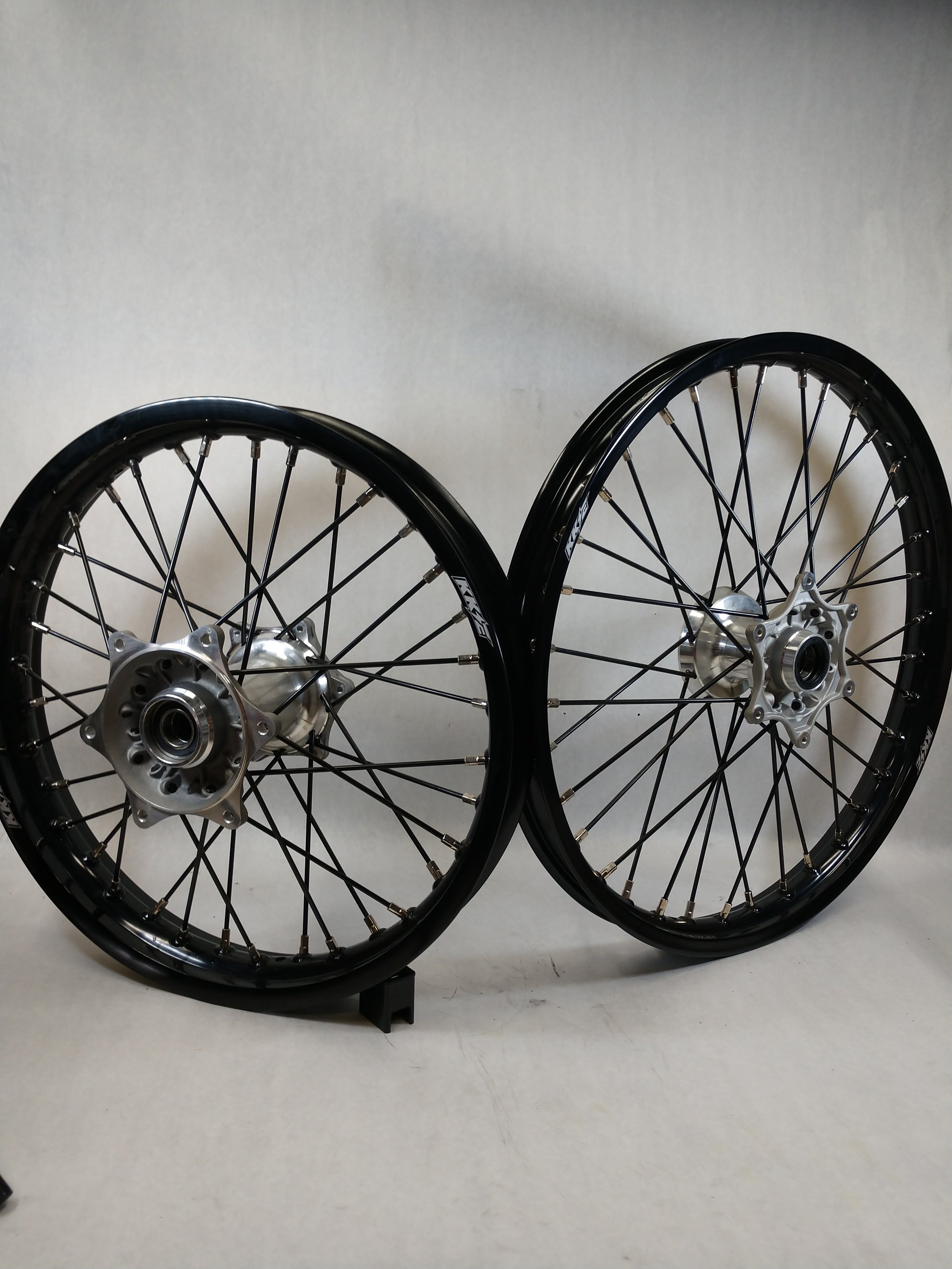 Ready to ship 2005-2023 KTM/Husky/GasGas/StarkVarg Motocross Black Wheel Set. This Wheelset has a Front 21x1.60 Black KKE with Silver Billet Hub A Rear 19x2.15 Black KKE with Silver Billet Hub